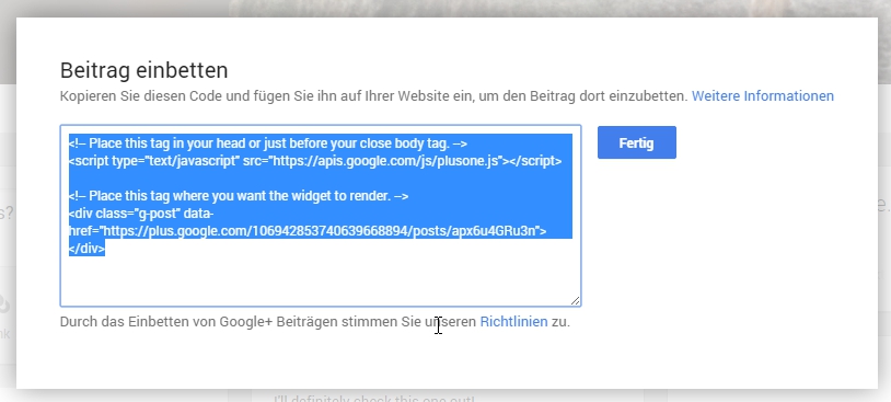 This is a short description about how to embed a Google+ post into an external web page. I basically followed the steps described by Charlie Southwell in his blog post here.
