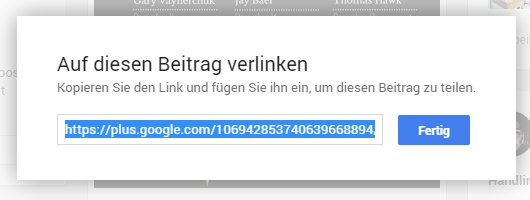 In the Google+ post, select the "link" option from the drop-down menu. This will open an additional window where the URL to the post is displayed and already selected: