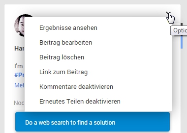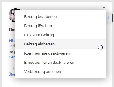 If the drop-down menu for the post offers the embedding option, the first step for embedding the Google+ post into your own web page is to select the embedding option from the menu as described above.